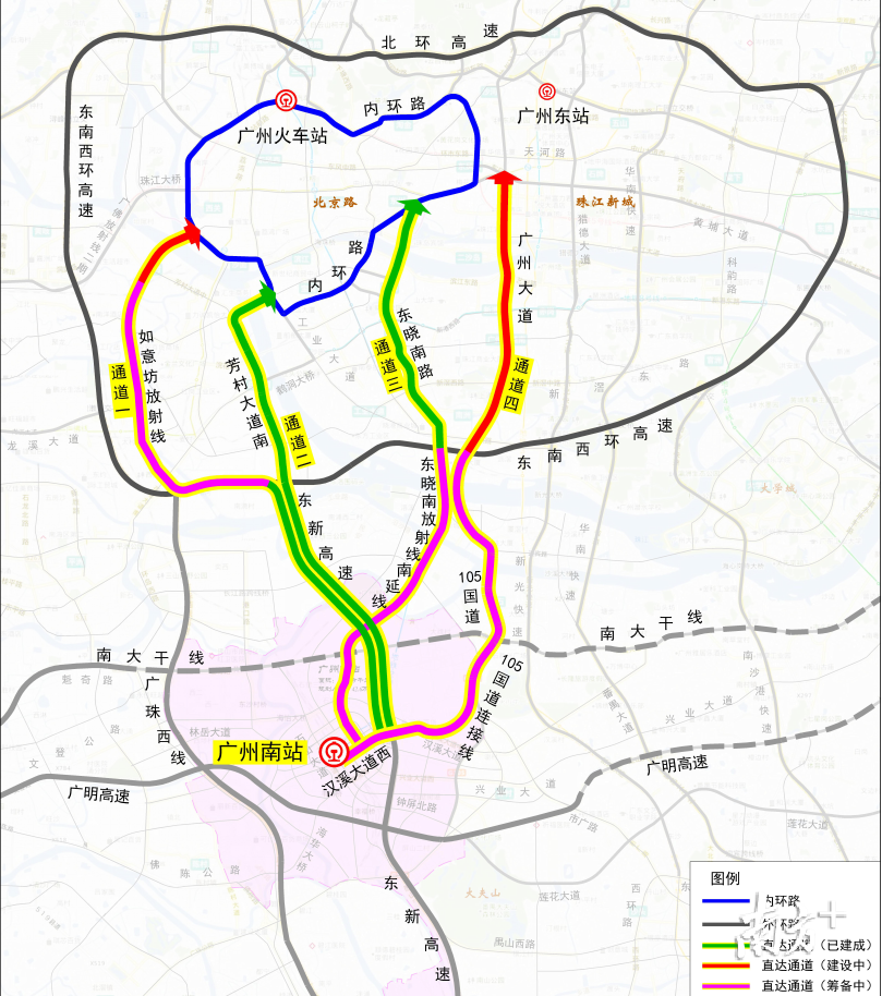 通道二:東新高速(已通)-芳村大道南(已完成快速化改造,4.8公里)-洲頭咀隧道(已通),13.8公里,需時(shí)10分鐘;