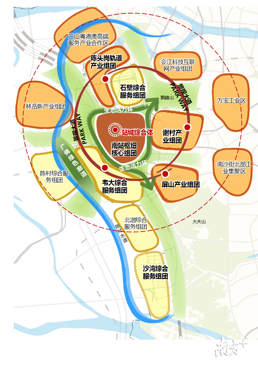 第三圈層為配套協(xié)同發(fā)展組團(tuán),包括會江產(chǎn)業(yè)組團(tuán)、林岳綜合服務(wù)組團(tuán)、陳村綜合服務(wù)組團(tuán)。